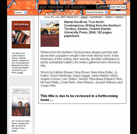 Curtin University of Technology Sie können True North beim Charles Darwin University Bookshop online bestellen, ISBN 1876248912 oder vom Northern Territory Writers' Centre.