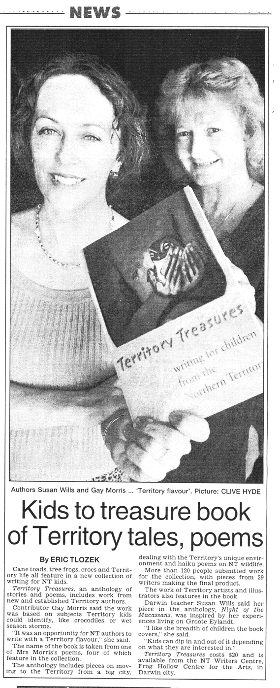Text-Kollektion für NT Kids beschrieben. Autorin Gay Morris sagte, dass die Werke auf Themen basieren, mit denen sich Kinder im Territory identifizieren können, wie etwa die Krokodile oder Geschichten über die Regenzeit. “Es war eine Gelegenheit für NT Autoren etwas mit einem Territory Flair zu schreiben," sagte sie. Der Buchtitel stammt von einem der Gedichte von Frau Morris, die vier weitere in der Kollektion hat. Die Anthologie enthält Stücke über den Umzug von einer großen Stadt ins Territory, wie man mit der einzigartigen Umwelt des Territorys umgeht und Haiku-Gedichte über die wilden Tiere des NT. Mehr als 120 Personen reichten ihre Arbeiten für die Kollektion ein, von denen es die Werke von 29 Autoren in das Endprodukt schafften. Die Arbeiten von Territory Illustratoren und Künstlern werden ebenfalls im Buch vorgestellt. Susan Wills, Lehrerin in Darwin, sagte, ihr Text in der Anthologie, Night of the Macassans, ist von ihren Erfahrungen auf Groote Eylandt inspiriert. “I mag die Bandbreite von Kindern, die das Buch abdeckt", sagte sie. “Kids können in es eintauchen und wieder rausgehen, je nachdem, woran sie interessiert sind.” Territory Treasures kostet $20 (plus AU$5 Versand) und ist vom Northern Territory Writers' Centre, Frog Hollows Centre for the Arts, in Darwin erhältlich.